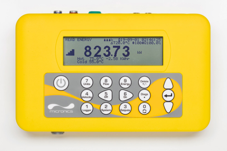 | Data Logging | 100,000,000 data points. 12 named sites. Download via USB to CSV file and export to Excel. Logs application details, time, date, flow rate, forward total, reverse total, flow velocity, flow side temperature, return side temperature, temperature difference, power, total energy, signal quality, signal SNR, signal status |